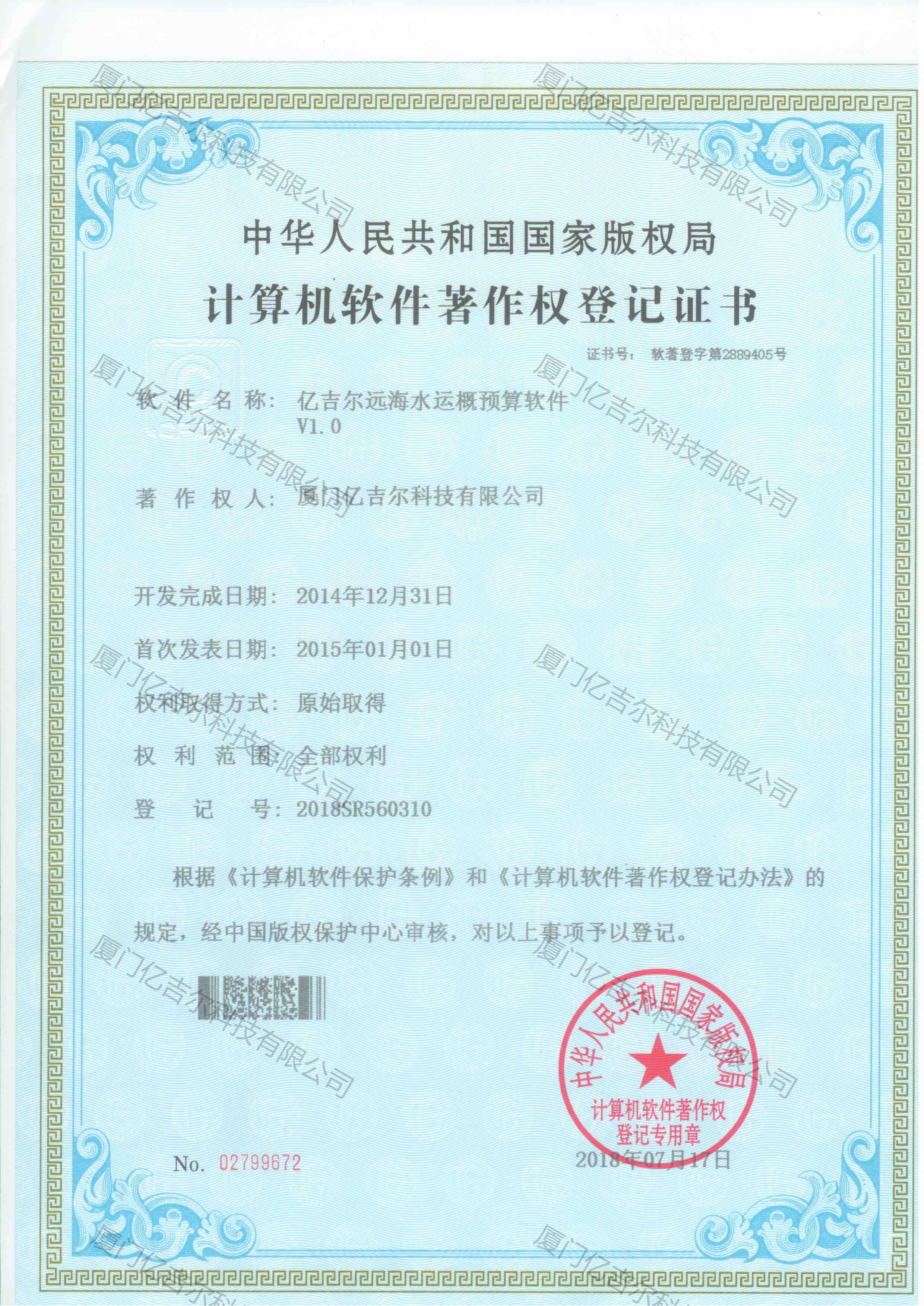 億吉爾遠海水運概預(yù)算軟件著作權(quán)登記證書 發(fā)布日期:2018年07月17日 瀏覽次數(shù):2987 關(guān)鍵字: 公司 1/1億吉爾遠海水運概預(yù)算軟件著作權(quán)登記證書